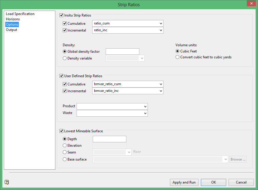 The Product and Waste options need to be populated with precalculated block model variables that contain the tonnes of product and the volume of waste. The stripping ratio is then calculated based on the Waste divided by the Product.