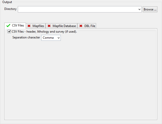 Select this tab box to output the information to some CSV files (.csv). By default, two files will be produced; one containing the header records and the other containing the lithology records.