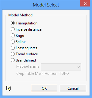 Select the Method name from the drop-down list. This to access any customised modelling methods previously set up through the Define Method option (under the Grid Calc > Edit Modelling Defaults submenu). If you have chosen to apply the horizon table crop layer as the mask (when defining the method), then the name of the crop layer displays on the panel.