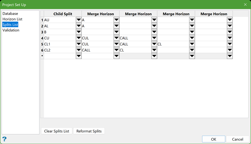 The Splits List defines the splitting relationships of seams. Seams without any splits are listed under the Child Split column. For seams that involve splitting, the smallest degree of splitting is defined in the Child Split column, with subsequent merging into larger seams to the right. The parent seam is the last seam merged on the right.