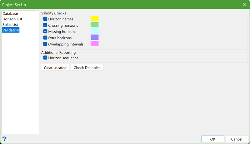 This section provides options to select the drillhole database, create and edit horizon lists, define splitting relationships, and check the validity of the drillholes. There are mainly four options: