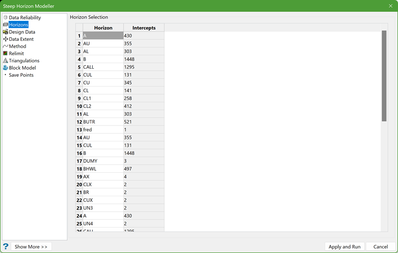 The output will be a set of surface or solid triangulations for each horizon selected. A block model can also be created with the horizon name assigned to a block model variable and the horizon solids assigned to the boundaries.