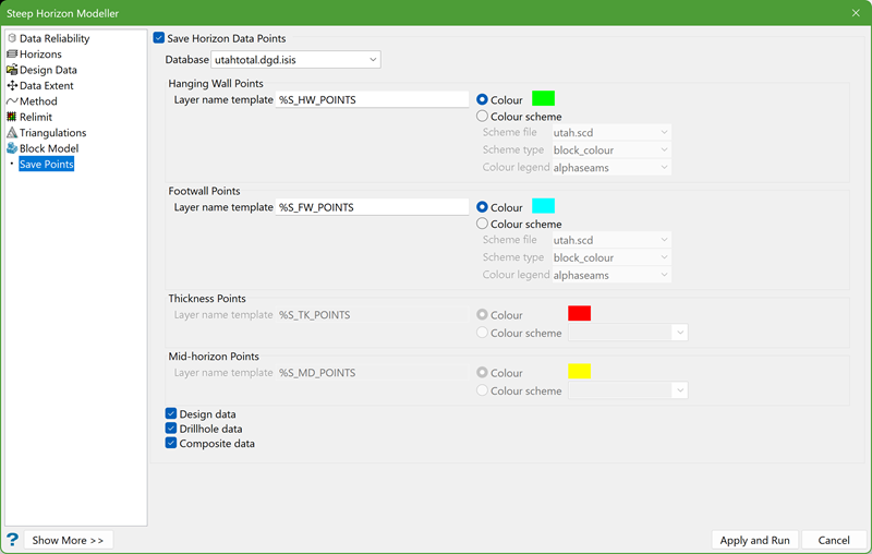 Note: The default value for the hanging wall data is %S_HW_POINTS and the footwall data is %S_FW_POINTS, which is as same as the default template in Save Points.