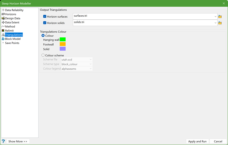 Note: The output surface triangulations are named with the convention <proj><horizon>.hwt for hanging wall or <proj><horizon>.fwt for footwall, where <proj> is the project prefix and <horizon> matches what is defined in the Horizons.