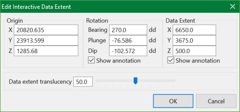 If this option is unchecked and the Interactive button is clicked, the modeller tool analyses the specified input data source including the data from drillhole, composite, and design databases, and fetches all the data of the selected horizons, figures out the best model plane and displays the 3D extent to include those data. The information of the extent’s origin point and bearing, plunge and dip, and the X, Y, Z extent sizes are calculated and displayed in the Edit Interactive Data Extent panel shown below.