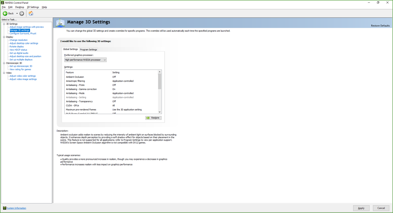 On the Global Settings tab, select High-performance NVIDIA processor.