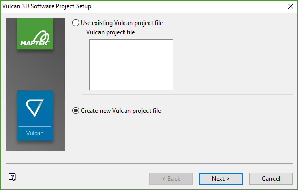 After selecting a data folder, the Vulcan 3D Software Project Setup panel is displayed. You will be prompted to choose an existing Vulcan project file if there is at least one file to select from or create a new one.