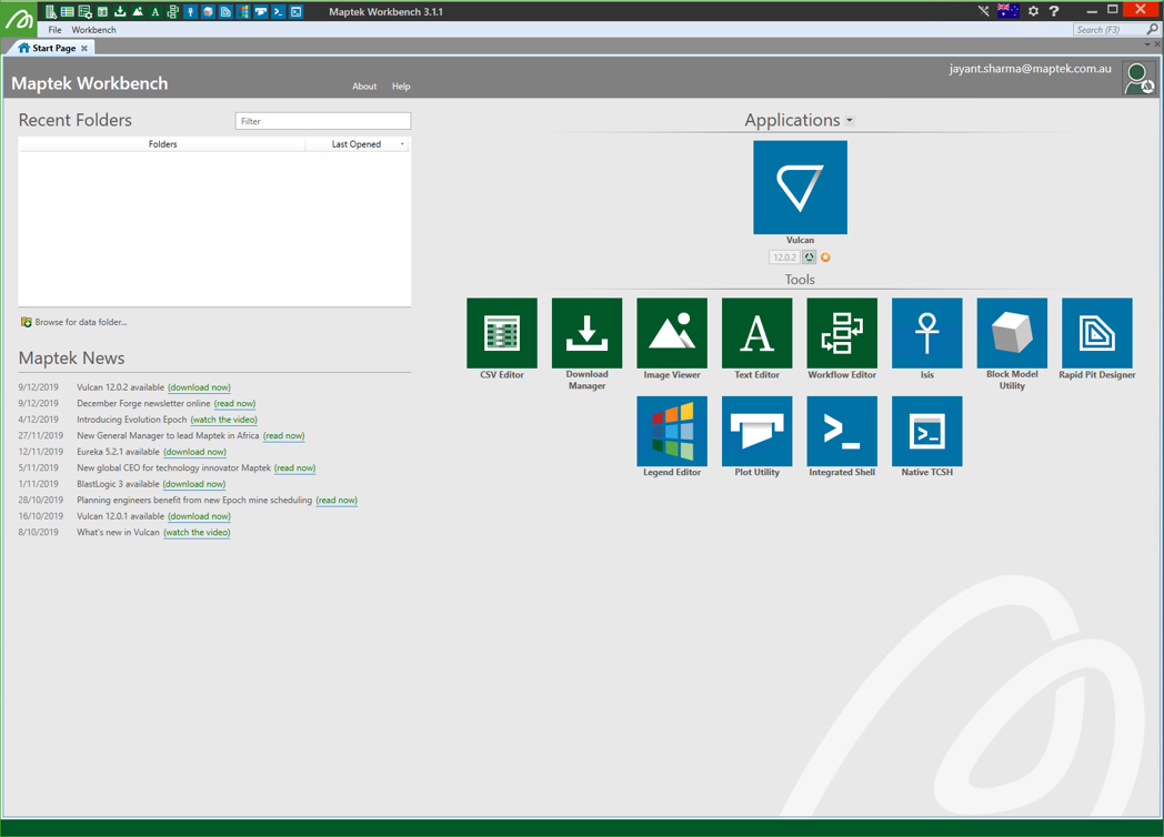 If you continue without using Maptek Account, you will be presented with the Maptek Workbench home page. The Workbench displays all installed Maptek applications including Vulcan, along with common tools required with the applications. On the top right is the Sign In option.