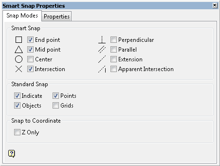 To enable snapping to the closest point based on its Z-coordinate value, tick the Z Only box. If this box is greyed out, select Indicate and one or more Standard Snap features. Ticking the Z Only box disables the Perpendicular, Parallel, Extension, and Apparent Intersection drawing options in this tab.