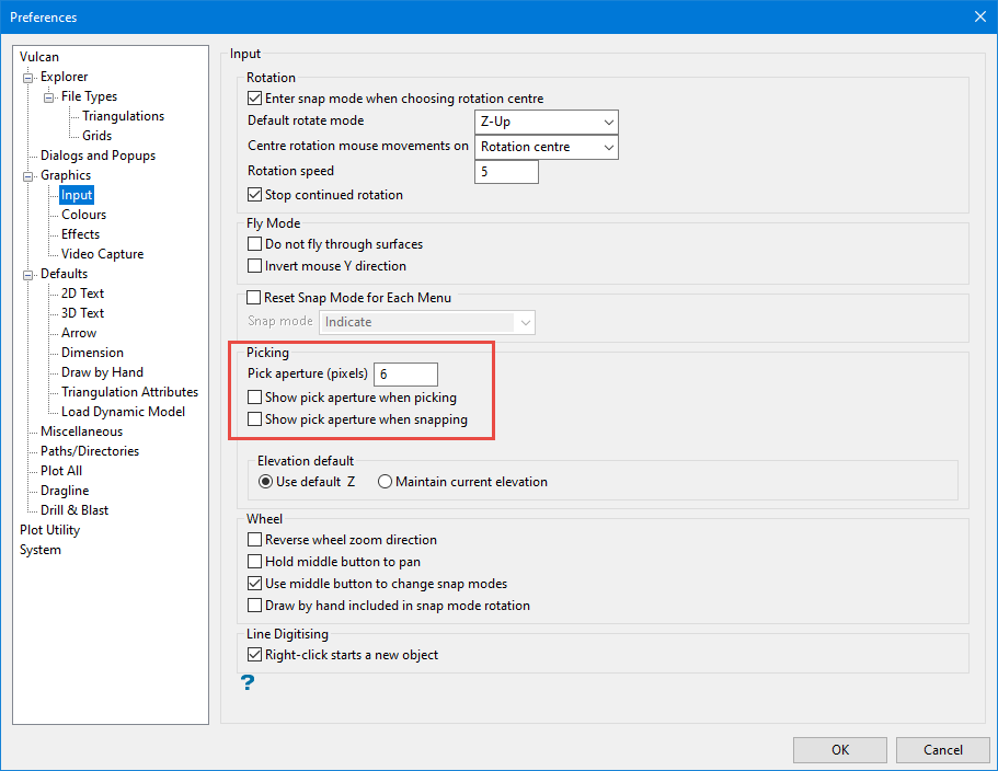 The maximum distance that the cursor can be from the object and still snap to the object is defined by the pick aperture, which is set through the Graphics : Input section of the Tools > Preferences option. (See below.) Objects need to be displayed on the screen to use this mode.