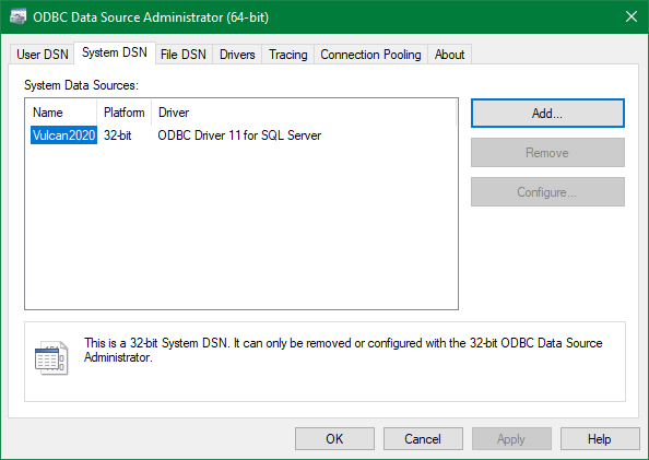 - Open the ODBC Data Source Administrator tool. To do that, navigate to Start > Programs > Windows Administrative Tools, and choose ODBC Data Sources (64-bit) or ODBC Data Sources (32-bit). Optionally, you can search for ODBC Data Source in the Windows Start menu and locate the tool. For Vulcan 2020 and onwards, 32-bit is not supported.