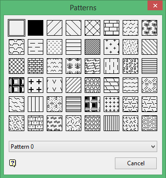 To select a pattern, click on the required pattern. New objects will be created with the selected pattern. The Graphics option (under the Design > Attribute Edit submenu) can be used to change an existing object's pattern. The currently selected pattern is shown in the Status toolbar and often referred to as the current or default pattern.