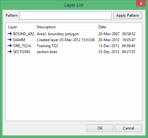 Layers indicated by an arrow are already loaded. The Description column shows the layer description as entered by the user. If no description has been entered, the default is used which is the date and time of creation. The Date and Time columns show the date and time of the last modification to the layer. The column widths can be adjusted by dragging the vertical bar between the headings.