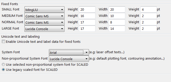 The fixed fonts remain the same size on the screen regardless of the current zoom and always appear 'face on' (horizontal) regardless of the drafting angle. The drafting angle is only followed when a hard copy plot is produced. Any Unicode character is supported when you use this font. Data posting uses System Font as a default/fallback font, but it also has the Font setting in its display option as its chosen Font. You can control the appearance of these fonts by altering the settings in Settings > Preferences.