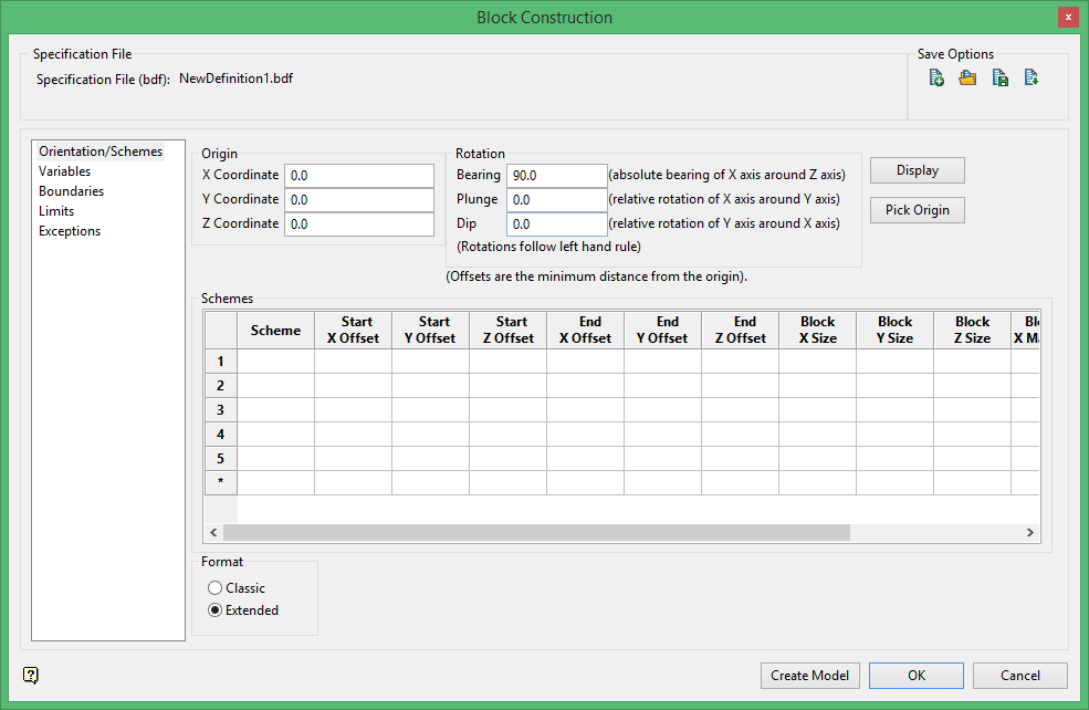 . This will open up the Block Construction panel as shown below. This is the block definition file. It contains the coordinates of the block model, orientation information, list of variables, block sizes, roles of various triangulations and more. For a complete explanation of all the attributes of the block definition file please see Tutorial - Load Dynamic Model.