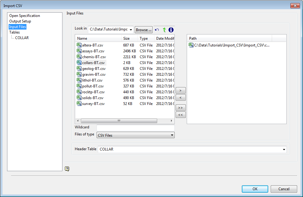 Note You can select additional files the same way, or you can select all files by clicking the >> button. - Select COLLAR from the Header Table drop-down menu.