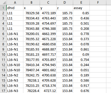 Open up the data.csv file and notice that we have five columns of data: dhid, x, y, z, and assay. This is the minimum data that is needed to create a database. Each row of data shows the name of a sample, the location, and the information about that sample that we want to display.
