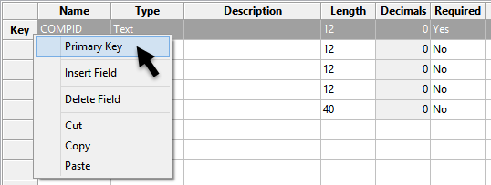 As a final step, right-click in the column to the left of the Name field next to COMPID to display a context menu, then select Primary Key.