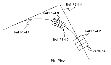 RAMP34.A : Alignment for design RAMP34 >> PRIMARY RAMP34.D : Road X Sections for design RAMP34 >> PRIMARY RAMP34.H : Horizontal IP for design RAMP34 >> PRIMARY RAMP34.L : Long section for design RAMP34 >> LONG_SECT RAMP34.N : Joining road lines for design RAMP34 >> PRIMARY RAMP34.P : Joining NS lines for design RAMP34 >> PRIMARY RAMP34.R : Road Section for design RAMP34 >> ROAD_SECT RAMP34.S : Superelevation for design RAMP34 >> LONG_SECT RAMP34.T : Topo X sections for design RAMP34 >> PRIMARY RAMP34.V : Vertical IP for design RAMP34 >> LONG_SECT RAMP34.C : Conditional cross section for RAMP34 >> ROAD_SECT RAMP34.M : Mass haul diagram for design RAMP34 >> LONG_SECTAn example of the layers, labelled with their names, is shown in Diagrams 1a - 1c. Each layer has its own line type and colour associated with it.