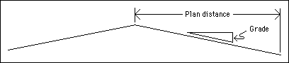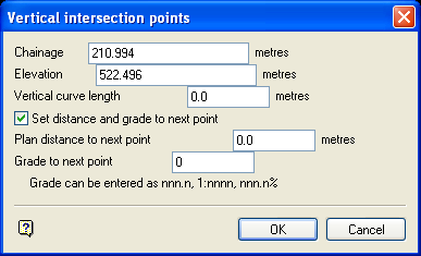 Select this checkbox to set the next point at a fixed distance and grade from the current point. The grade can be entered as decimal degrees (nnn.n), as a normal grade specification (1:nnnn) or as a percentage (nnn.n%). See also Appendix B. You can also specify the next intersection point by clicking OK on the panel and indicating the point normally.