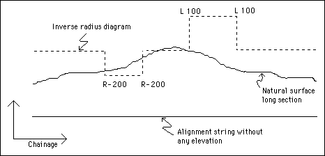 The long section window displays the data with increasing chainage in the X direction and elevation in the Y direction. The alignment string is the same object as in the plan window, but seen in a different view. Associated with the alignment is what is known as an Inverse Radius Diagram. This is a means of correlating the curves on the horizontal alignment with the vertical grades.