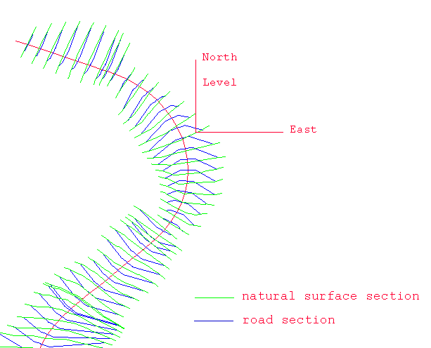 Each natural surface section is also an object, with the alignment point name as the object name. The natural surface sections are stored in a layer named <design_name>.T. The point names of each section indicate the point type, and is either NSLEFT or NSRIGHT.