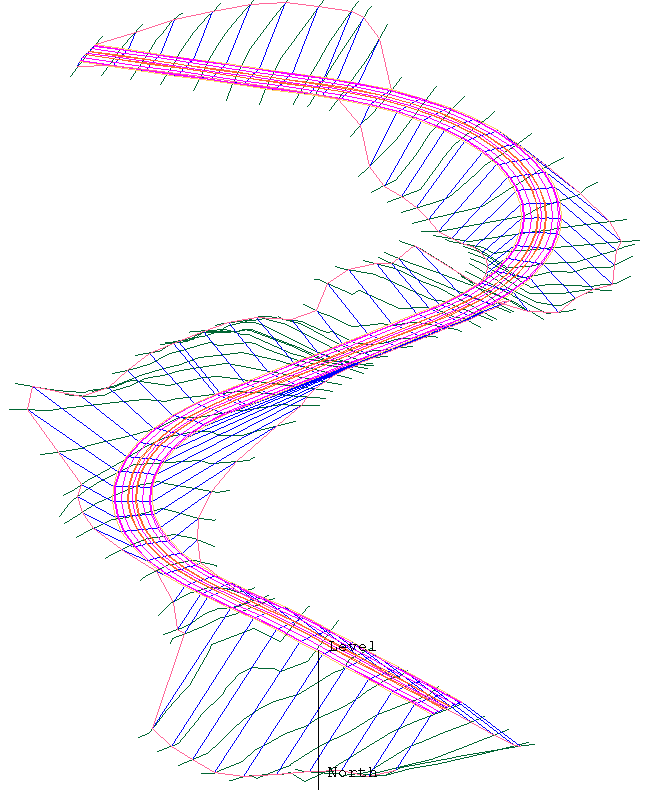 Use the Connect Sections option to join cross sections generated by the Apply Sections option, to create a more appealing road design. The sections are joined together by a set of lines. Each line connects similar named points on the road, or on the natural surface section.
