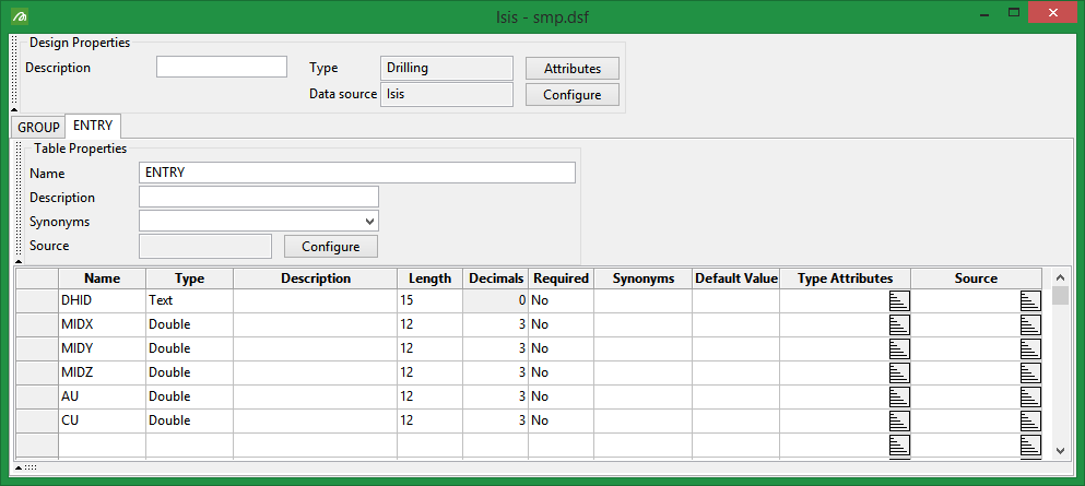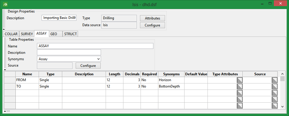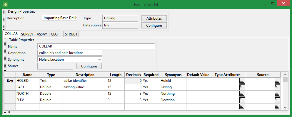 5 tables: Collar, Survey, Assay, Geo, and Struct.
