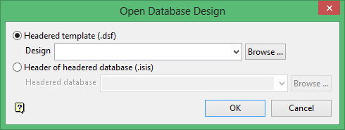 Select this option to open a Headered template design. These are the designs from which you can create Isis File and ODBC Link databases. Enter the desired design name or select from the drop-down list. Click Browse to select a file from another location.