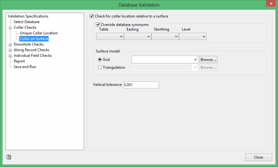 Select this check box to check for the collars of a database lying on a given surface. The check is the Z variation between the collar's Z value and the Z value of the collar's XY location registered to the given surface. If this is greater than the tolerance given, or if the surface is not hit by the collar, then the validation will fail.