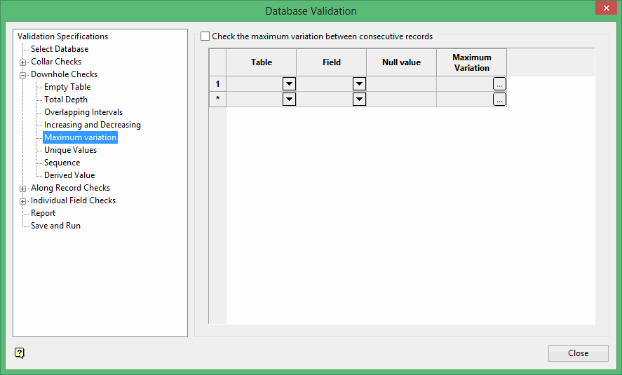 Select this check box to check for the maximum variation between consecutive records. You will need to select the tables and fields from the drop-down lists as well as specify the appropriate tolerance and null values.