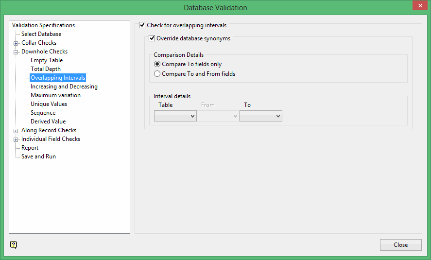 Select this check box to specify whether to compare only the To or both the To and From fields, and also which database table and fields (columns) to use in the overlapping intervals check.