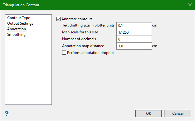Minor contours are eliminated if the ground distance (plan view distance) between contours is less than this value. If you do not want dropout to occur, then set the dropout distance to 0.