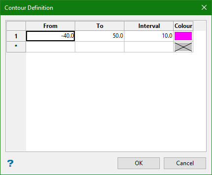 The Colour options are displayed if you have chosen to create normal contours or to contour one level. For normal contours, select a colour for the major and minor contours. For one contour level, select the colour for the contour.