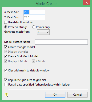 This option merely lays a grid over a triangulation, which is generated from the coordinate data. It does not allow for other more sophisticated algorithms, such as smoothing and inverse distance. These are available in the Vulcan Grid Model option and Grid Calc.