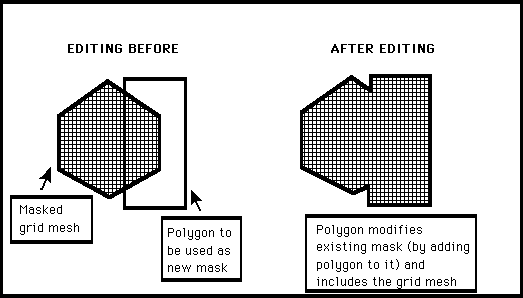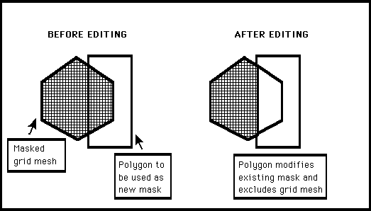 In Diagram 3, the polygon has replaced the original mask and the grid mesh is excluded by the new mask. The extent and shape of the grid mesh is defined when the mesh is created (see Create option).