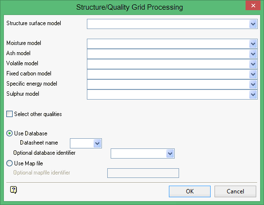 Use the Create Mapfile option to create a mapfile by interpolating quality values based on a structure grid and several quality grid surfaces. The mapfile can then be used in grade estimation.