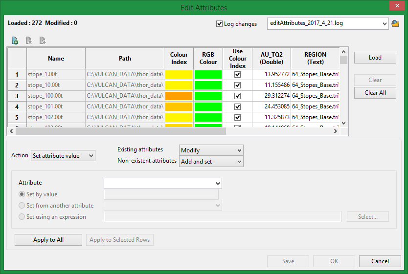 This grid shows the loaded triangulations and all their attributes, including the colour information. The attributes are in alphabetical order left to right. Copying and pasting are allowed. Columns can be selected by clicking in the column headers, and rows can be selected by clicking in the row header at the left hand side.