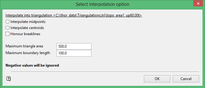 Select this option to add points at the midpoints of the edges of all triangles that exceed the area tolerance. Breaklines and all triangle edges are always honoured when this method of interpolation is used. Interpolating midpoints is applicable to both surfaces and solid triangulations.