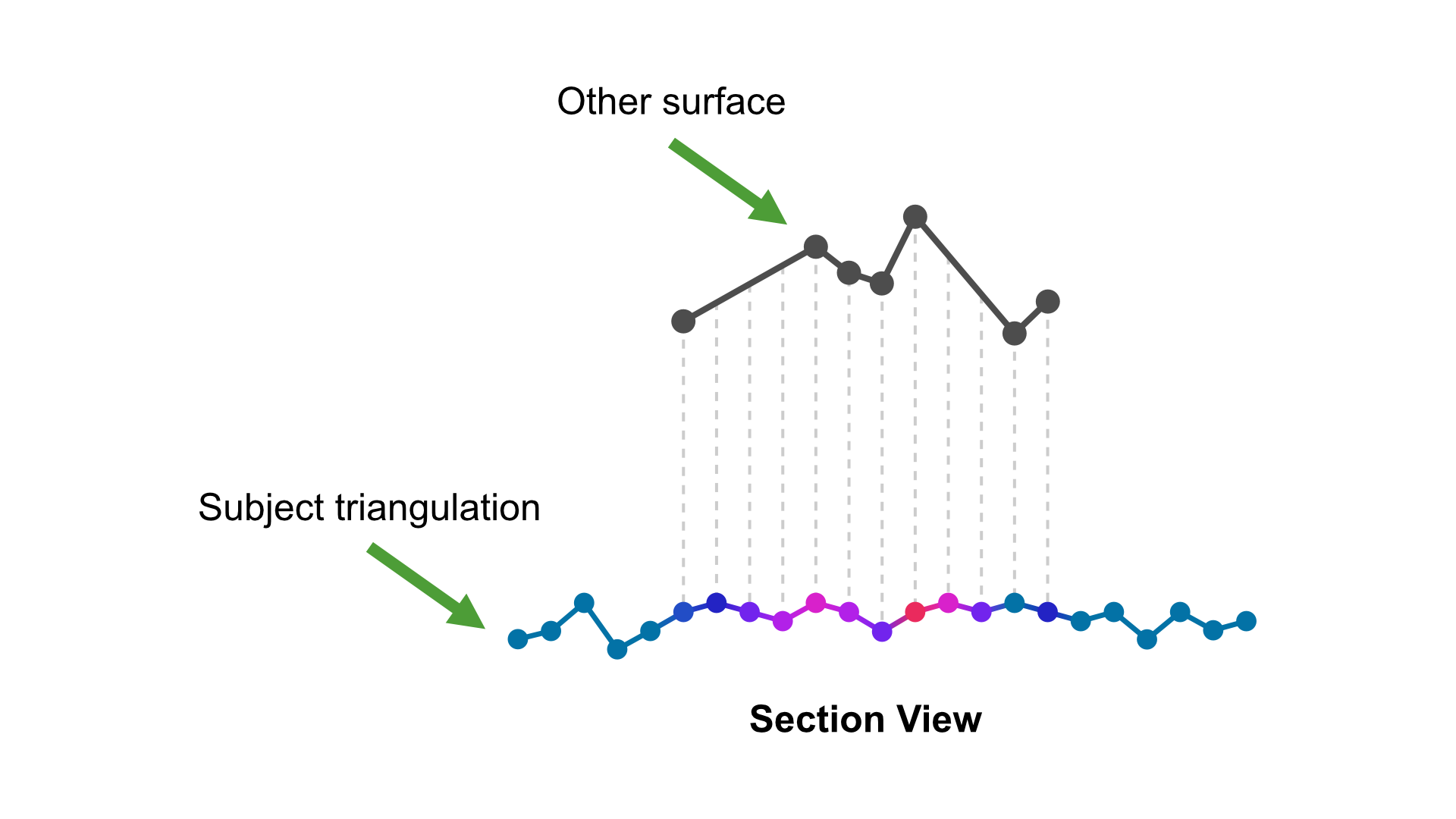 NoteWith this option, points from the other surface will be projected (in plan-view orientation) onto the subject triangulation and the other surface’s Z-axis values will be used to colour the triangulation at corresponding vertices. If portions of the subject triangulation fall outside of the extents of the projected other surface, then the minimum Z-axis value of the projected other surface will be used to colour the triangulation in these areas.