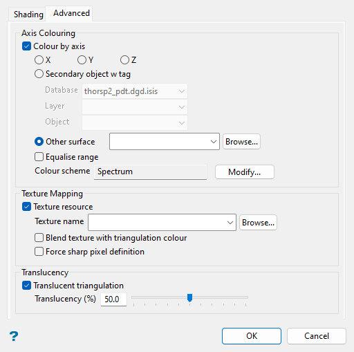 Select the Colour by axis checkbox to colour the triangulation by its X, Y, or Z-axis, by the w tag of a secondary object, or by the Z-axis of another surface (i.e. a triangulation or grid).