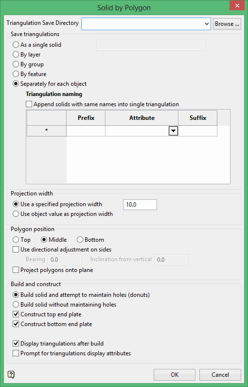 The width of the triangulations can be a specified projection width that is assigned to all triangulations or the object value (width of the triangulation) of each polygon. Selecting Use object value as projection width may result in different widths for each triangulation.