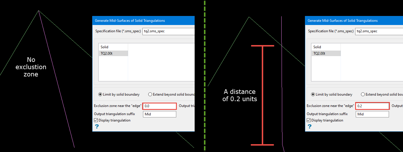 Enter the distance of the Exclusion zone near the "edge". This is the distance from the inside edge of the solid that the mid-surface triangulation will project perfectly vertical.