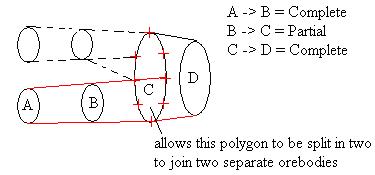 Select this option to specify the start and end points of a selected string. Thus separating a string into two sections. Once selected, a part of the string will be highlighted and you will need to specify whether or not you want to triangulate this part or the remaining section. This option is useful when triangulating bifurcating ore bodies (sometimes referred to, in 3D modelling, as trouser legs).