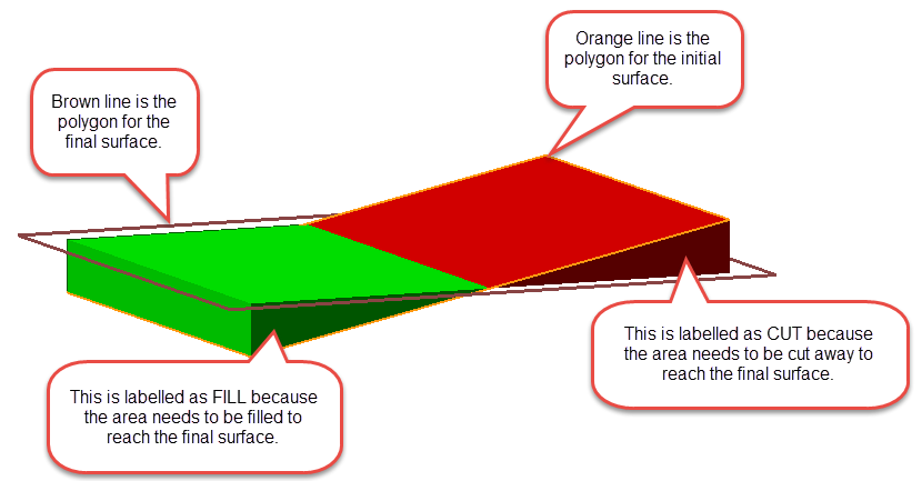 This option allows you to build solids defined by two surfaces working in plan view. The surfaces are assumed to be two successive topographies. The solids between them correspond to Cut and Fill solids. There is no constraint on surface sizes or mutual position apart from the overlap in plan view.