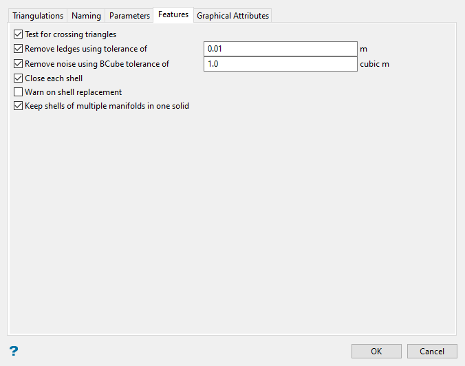 Select Remove noise using BCube tolerance to remove the little disconnected sections of a triangulation that are created when performing the clipping. It is possible to get a lot of little sections and one main section of interest. The BCube tolerance refers to the volume of the cube that bounds the island in 3D space.