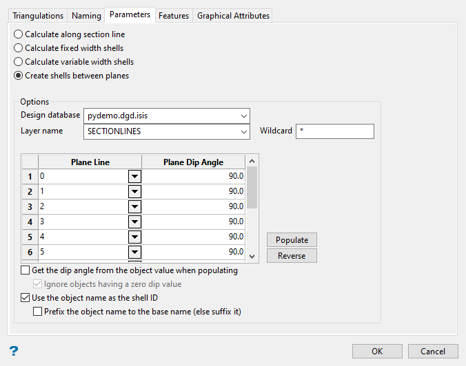 Select Get the dip angle from the object when populating if you want to read the dip angle from the object value field. The dip can be assign to the object value of a line by using Design > Attribute Edit > Value.