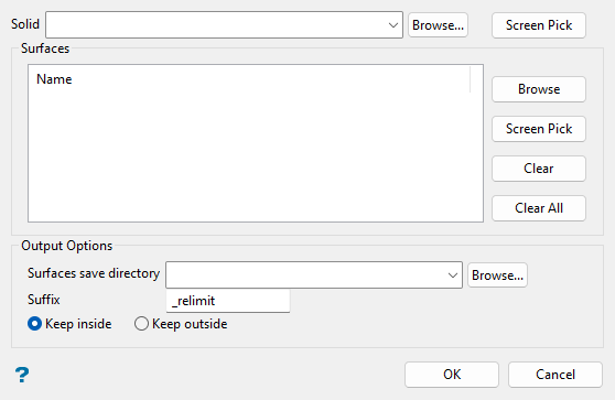 Specify what portion of the surfaces you want to retain with relimiting, that is, save the areas inside the nominated solid triangulation (Keep inside) or save the areas outside of the nominated solid triangulation (Keep outside).