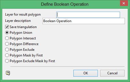 Use this option to merge polygons using Boolean functions. For example, the intersection of 100 polygons can be generated. The results can be saved as both a polygon string and/or a triangulation.