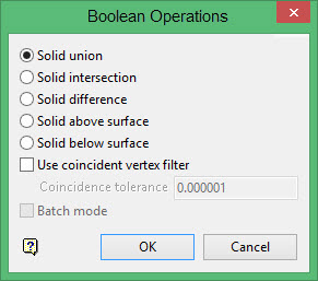 (Optional) Select Batch mode to select several triangulations at once, and then another group of triangulations for the Boolean. This is useful when there are large overlaps resulting from different designs meeting at the same place.